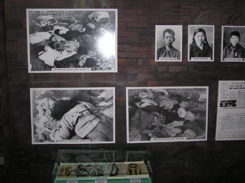 from various incidents are displayed. But in Sinchon they have gone one better. In one massacre 400 women and 102 children were put