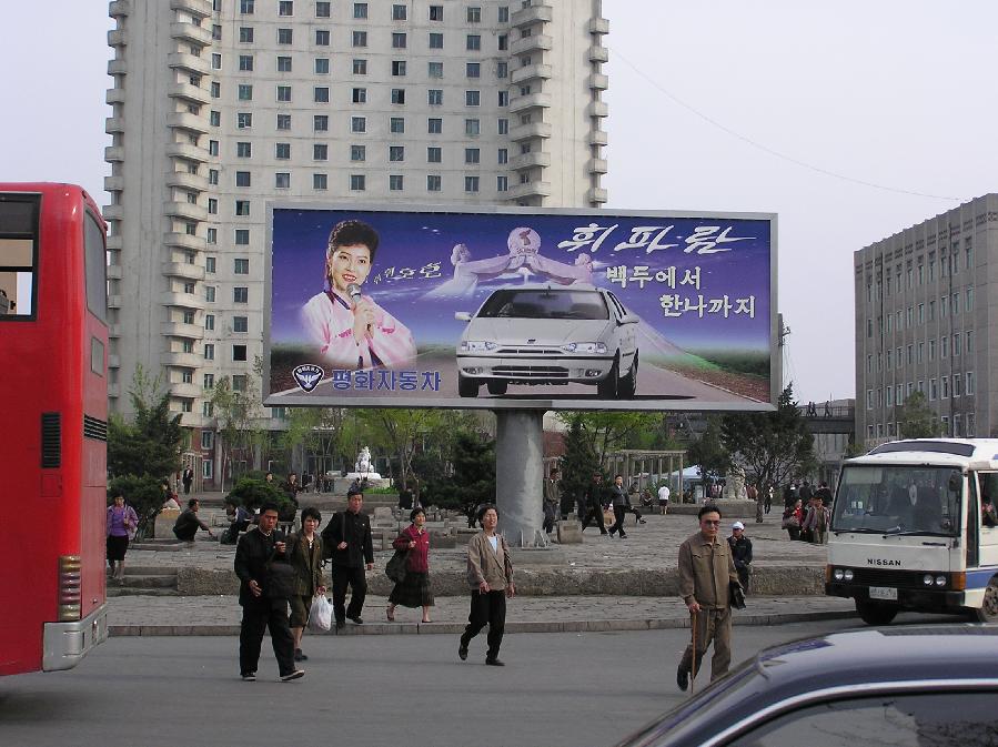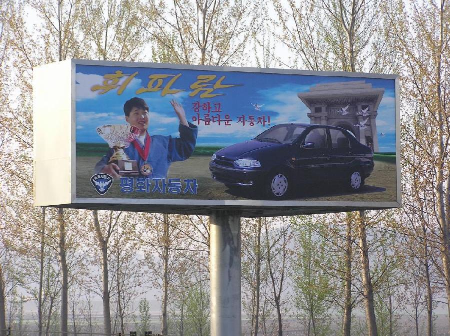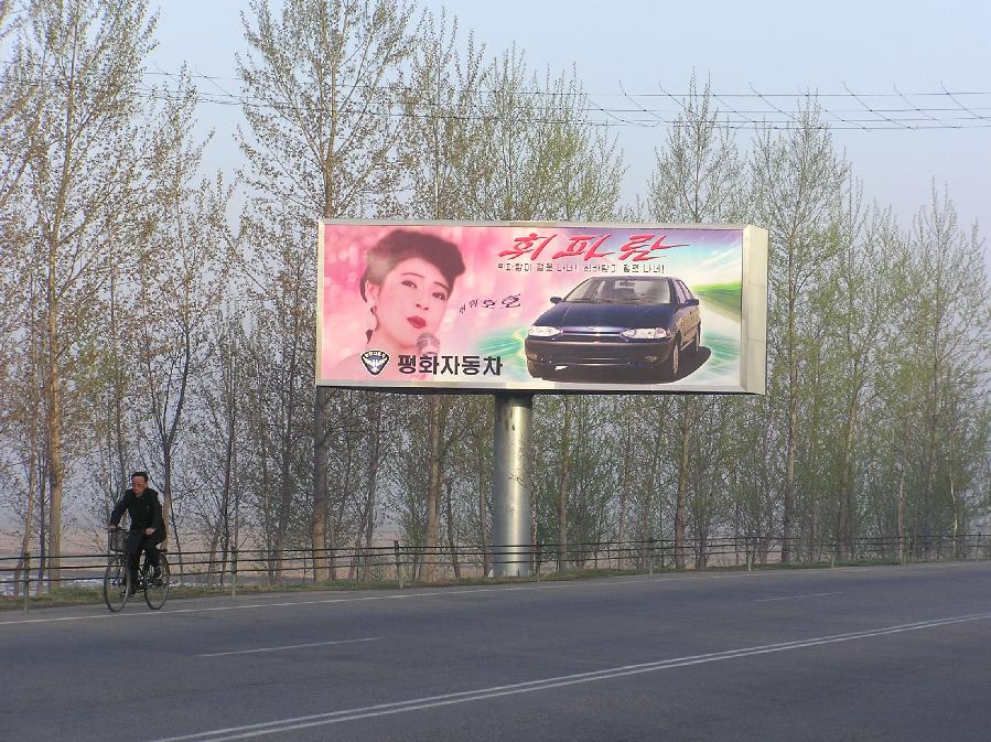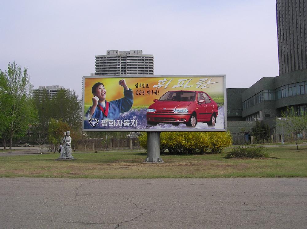 The first thing to hit me was a mile from the airport: 2 Western-style billboards for the Fiat car now assembled in the DPRK ('Whistle'.)