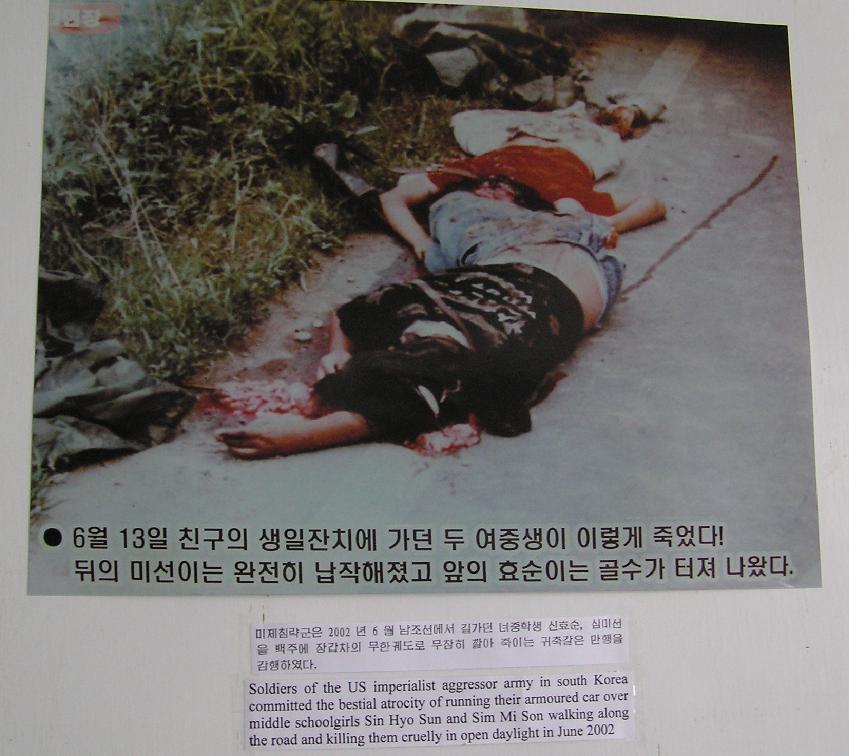 Wonsan. It shows the two girls run over and killed in South Korea in 6/2002. The brains of one girl are spewed out on the road. The
