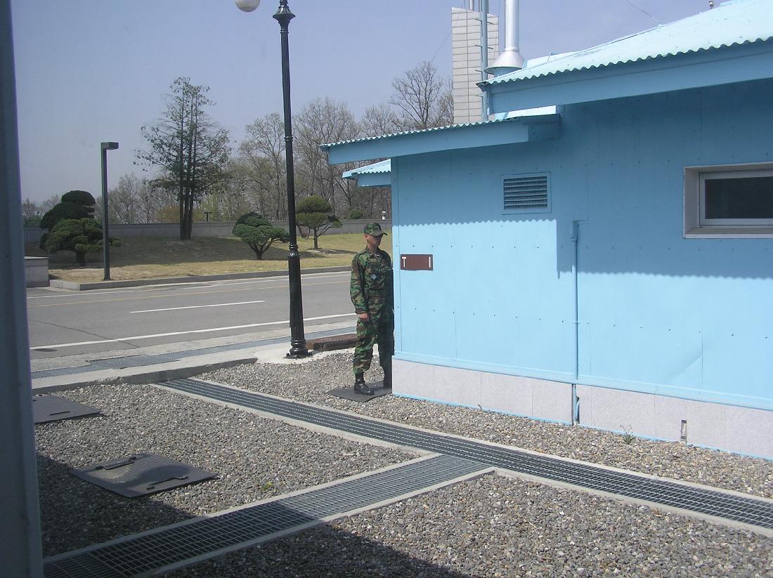 9. Panmunjon, DMZ. The axe from the 1976 incident. Farming inside the DMZ. ROK soldier looking in.